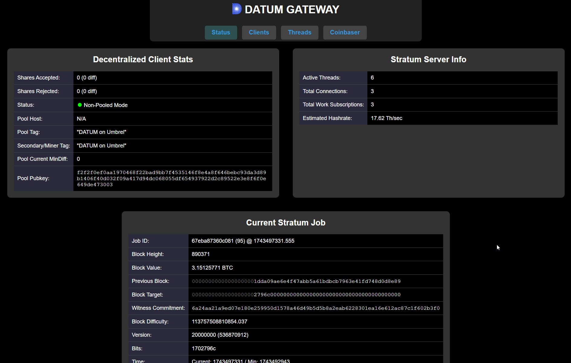 http://umbrel:21000orhttp://192.168.1.162:21000 - Check the Status page to confirm it shows “Non-Pooled Mode”